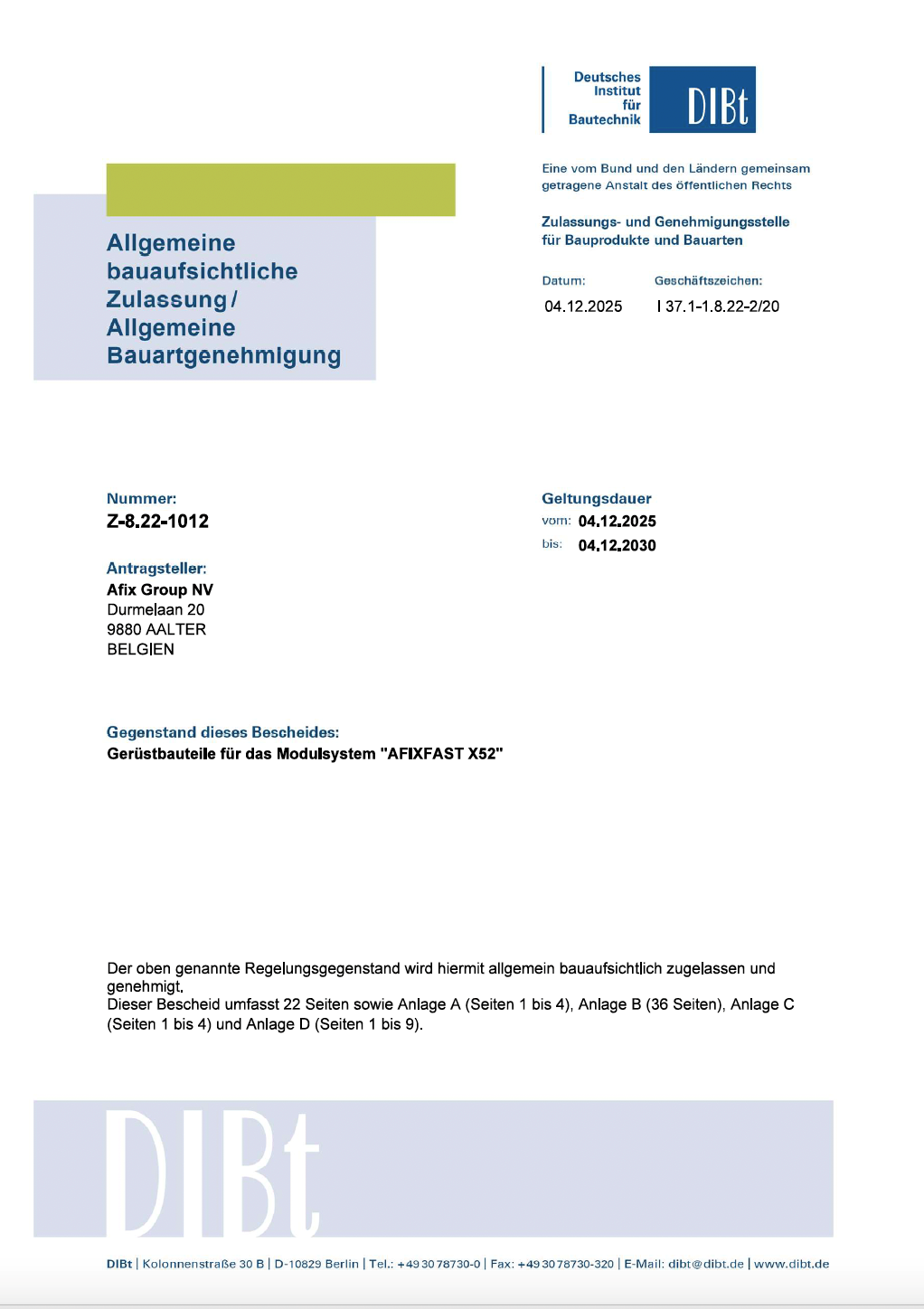 Daher gilt die DIBt-Zulassung in vielen europäischen Ländern als de-facto-Qualitätssiegel. - Das DIBt erteilt in den deutschen Bundesländern offiziell anerkannte technische Zulassungen für die Verwendung einzelner Gerüstbauteile sowie die Genehmigung der Bauweise von Gerüstkonstruktionen.