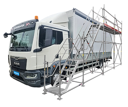 Der rutschsichere Treppenaufgang und die 3 m hohe Arbeitsplattform gewährleisten einen sicheren Zugang zu jedem LKW oder Nutzfahrzeug. Auch auf unebenen Untergründen bleibt das System dank verstellbarer Spindelfüße absolut standfest.