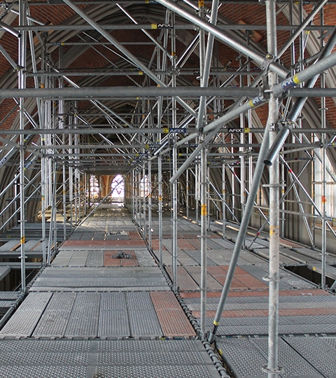 Eine Reihe von Fundamentgerüsten wurde im Schiff versenkt, damit der erste Gerüststrich ausgepackt werden konnte. Die eigentliche Herausforderung stellten jedoch die konischen Kuppeln im Dachfirst dar. Mit Hilfe von Keilformen und Kippspindeln gelang es dem Dachdecker- und Tischlerhandwerker Henk Debaeke in Zusammenarbeit mit der Firma Refort BV, sichere Stützen und Aufhängungen zu schaffen, so dass künftige Arbeiten in der Höhe sicher ausgeführt werden können. Das Ergebnis und das Volumen der Gerüstkonstruktion können sich sehen lassen.