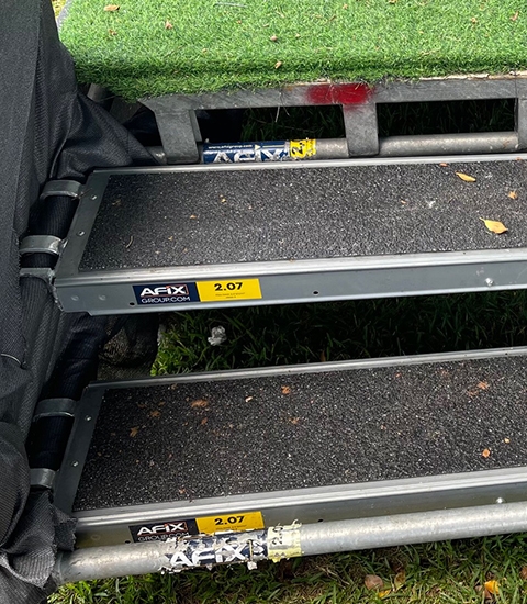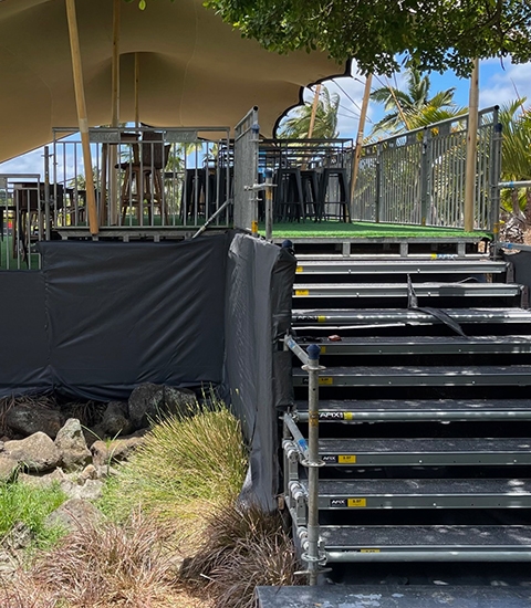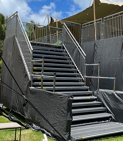 To create the best possible experience for both players and spectators, Afix Mauritius delivered a range of specialised scaffolding solutions tailored to the event’s unique needs. We installed anti-slip, non-perforated stair treads leading up to the main stages, adding a VIP look and feel while ensuring maximum safety. Strategically placed elevated lookouts with stretch tents provided covered, comfortable viewing areas near the holes, allowing guests to enjoy the best vantage points. Additionally, public staircases with compliant steel handrails improved crowd movement across the venue. Our elevated platforms for LED advertising screens gave sponsors high visibility, ensuring their branding reached the thousands of attendees. The short-term rental scaffolding for grandstands and podiums ensured that every aspect of the tournament was executed with precision. By seamlessly integrating functionality with aesthetics, Afix Mauritius reinforced its reputation as a trusted provider of high-quality scaffolding solutions for premium sporting events.