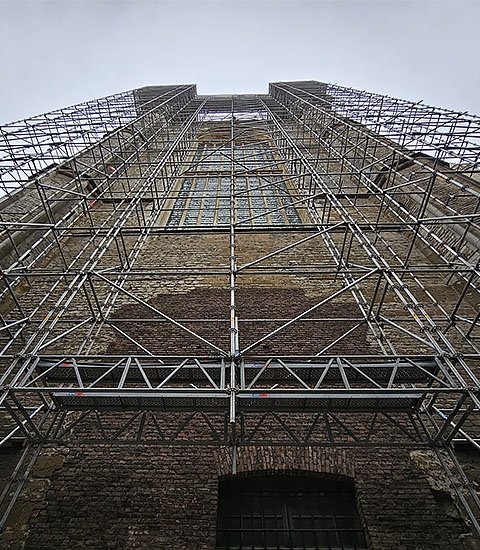 El equipo de montaje de andamios Afix colocó a la altura de la calle Kapittelstraat un impresionante andamiaje de fachada de 1.000 m² de plataformas de altura con andamiaje de extensión alrededor de las 2 torres. Los 4 pisos de la torre a 45 m de altura incluyen otros 600 m² de material de andamiaje adicional, incluida una pasarela con pisos de andamiaje AFIX Fast de acero que conecta ambas torres. Las escaleras de andamio ligero de aluminio también permiten ahora a los especialistas en restauración acceder con seguridad al taller en altura.