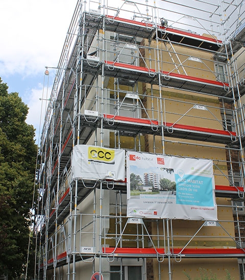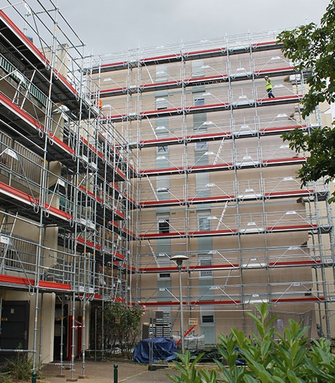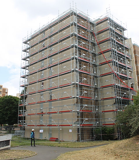 TAVERNY - Les échafaudages Afix Fast X37 métrique sont assemblés en 5 niveau's de travail jusqu'a 12,5 m de hauteur autour de 112 appartements.