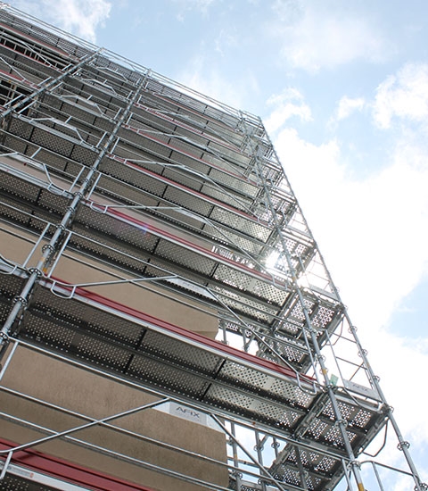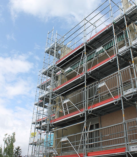 Au total, plus de 60 tonnes de matériel ont été utilisées comme échafaudage de rénovation pour les 5 étages supérieurs. L'échafaudage multidirectionnel (1,00 x 12 m hauteur) a été érigée à 60 cm de la façade extérieure des bâtiments ou se situent 112 appartements. Les protections MDS sur chaque niveau augmentent la sécurité de travail en hauteur.