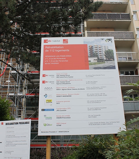 Le maître d'ouvrage CDC Habitat Social a donné le feu vert au maître d'œuvre GCC pour la rénovation de 112 appartements de la résidence "Les Primevères" à Ville de Taverny (Paris). Un échafaudage métrique Afix Fast X37 à été installé tout autour des immeubles d'habitation pour faciliter les travaux d'isolation et de revêtement de façade. Afix Fast X37 est un échafaudage multidirectionnel métric homologué NF-096, fréquemment utilisé pour les travaux de construction et de rénovation.
