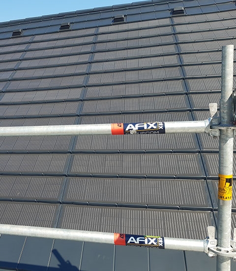 Prof@work speelt als allround dakdekkersbedrijf uit Geel accuraat in op de groene golf. Naast dakrenovatie, isolatie en herstelling voorzien zij ook in de plaatsing van een nieuw type zonnecellen eQUBE van producent RoofTG Europe, lid van de IKO Group, die uniform in de dakstructuur ingewerkt worden. Om potentiële klanten van dichtbij en op hoogte kennis te laten maken met hun vakmanschap, werd een showproject op een hellend dak gerealiseerd in Ham met aanhorige Afix Fast X52 inspectiesteiger. De vrijstaande steigerconstructie werd middels voetspindels horizontaal uitgelijnd en bevat 3 niveaus die via aanbouw aluminium lichtgewicht steigertrappen leiden naar het bezoekersplatform op 6 m hoogte. In de steiger werden trap, heup en knieleuningen geïntegreerd zodat de gasten samen met de Prof@work adviseur de geïntegreerde dakcellen op aanraakafstand kunnen inspecteren.