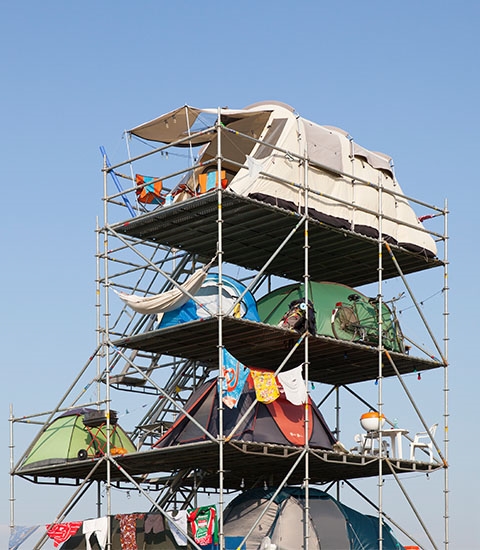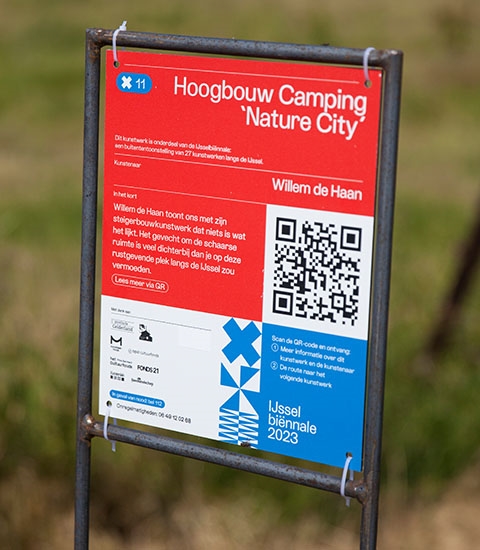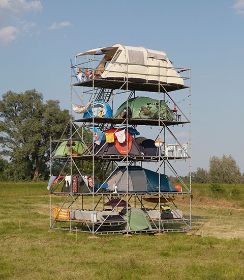 De buitententoonstelling bestaat uit 27 tijdelijke, monumentale én uitdagende kunstwerken van kunstenaars uit binnen- en buitenland. Op halte 11 in regio Deventer kan je werk terugvinden van Willem de Haan, een multidisciplinair kunstenaar die serieuze vraagstukken op een sculpturale, humorvolle manier benadert. In deze opstelling voegt Willem aan de landelijke locatie kunstmatige steigerelementen onverwacht toe. De hoogbouw camping bestaat uit een AFIX Fast systeemsteiger constructie met 5 niveaus. Elke verdieping op 0,5m, 2m, 4m, 6m en 8m bevat vloerelementen in staal als drager voor een tentenkamp. Via aanbouw lichtgewicht steigertrappen bereiken de "campingbewoners" veilig hun stulpje. Door middel van ballast blokken onderaan de constructie kan de verticale camping alle weer en wind trotseren.
