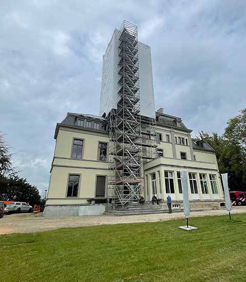 Na lange leegstand wordt het neo-classicistische landgoed volledig gerenoveerd, zodat vergaderlocaties, restaurant en overnachtingsmogelijkheden kunnen worden aangeboden. Omdat Stelmon stelling- en steigerbouw enkele jaren terug beide torens van La Grande Suissse vakkundig insteigerde, werd het bedrijf uit Riemst opnieuw aangesproken om ook de villa toren met steigers te omringen voor het uitvoeren van schilderwerken en houtreparaties.