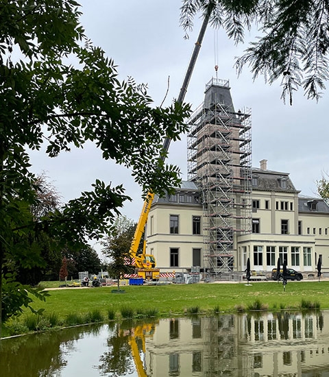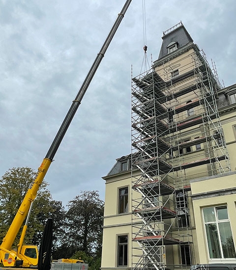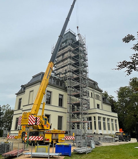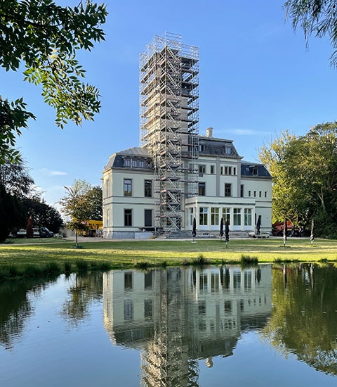 Gevel- en torensteiger voor renovatiewerkzaamheden aan Villa Kanjel.