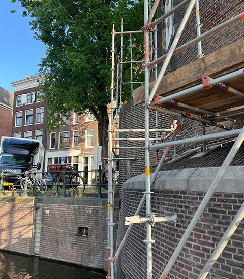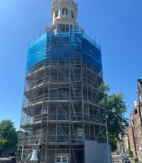 Voor de restauratie van de Montelbaanstoren was betrouwbaarheid en flexibiliteit cruciaal. Dankzij de Afix Fast systeemsteigers konden wij in korte tijd een stabiele op maat gemaakte rondbouwsteiger realiseren. De sterke constructie biedt ruime en veilige werkplatformen zelfs op 8 verdiepingen hoog.