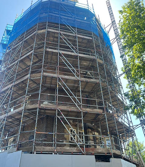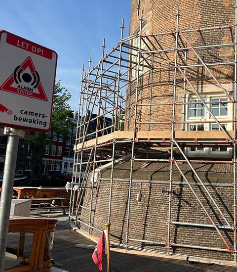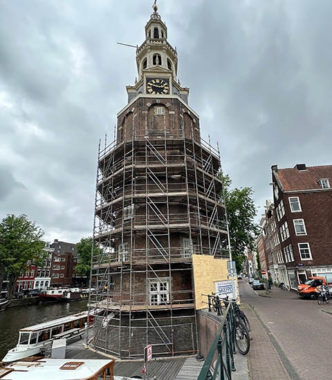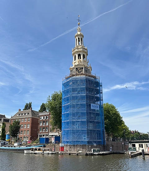 De 48 m hoge Montelbaanstoren aan de Oudeschans in Amsterdam werd in 1604 is gebouwd op de basementen van een verdedigingstoren uit 1516. Om problemen in het metselwerk aan te pakken wordt het historisch gebouw nu in de steigers gezet via een maatwerk rondbouwsteiger van 8 verdiepingen hoog met bovenop een steigerkap.